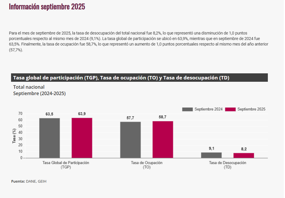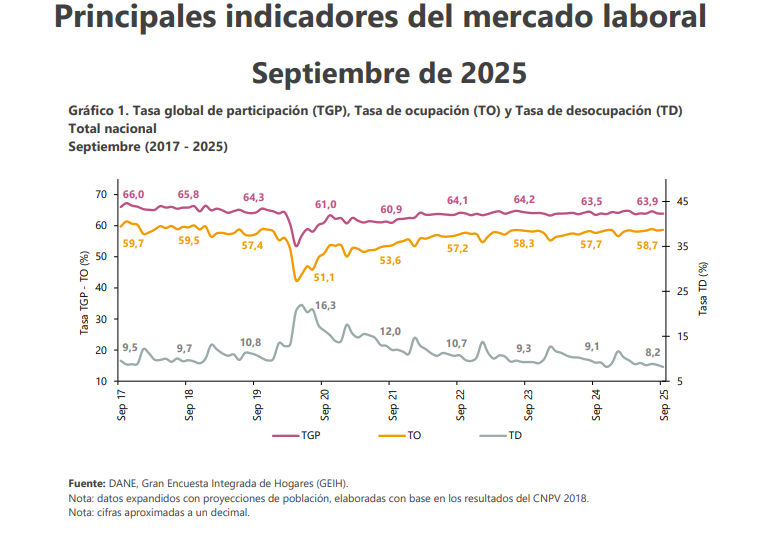 El mercado laboral colombiano continúa mostrando señales de recuperación. Según el más reciente informe del Departamento Administrativo Nacional de Estadística (DANE), la tasa de desocupación en el país se ubicó en 8,2 % durante septiembre de 2025, una disminución de 0,9 puntos porcentuales frente al mismo mes del año anterior, cuando fue de 9,1 %. Se trata de la cifra más baja registrada en toda la serie histórica reciente.