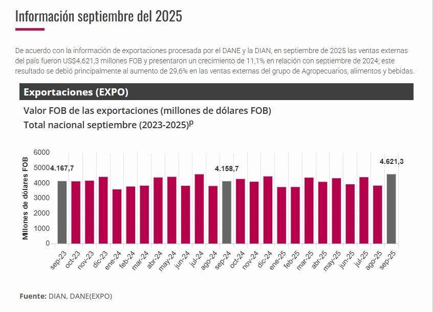 El comercio exterior colombiano mostró señales de recuperación durante septiembre, con exportaciones que alcanzaron los US$4.621,3 millones FOB, lo que representa un crecimiento del 11,1% frente al mismo mes del año anterior, según el más reciente informe del DANE.