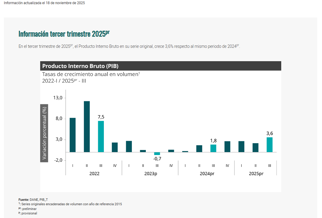 La economía colombiana consolidó una recuperación más marcada durante el tercer trimestre de 2025, al registrar un crecimiento anual del 3,6% en su Producto Interno Bruto (PIB), según el reporte preliminar divulgado por el Departamento Administrativo Nacional de Estadística (DANE). La cifra supera el ritmo observado en la primera mitad del año y evidencia una reactivación más dinámica de la demanda interna, especialmente de los hogares y del sector público.